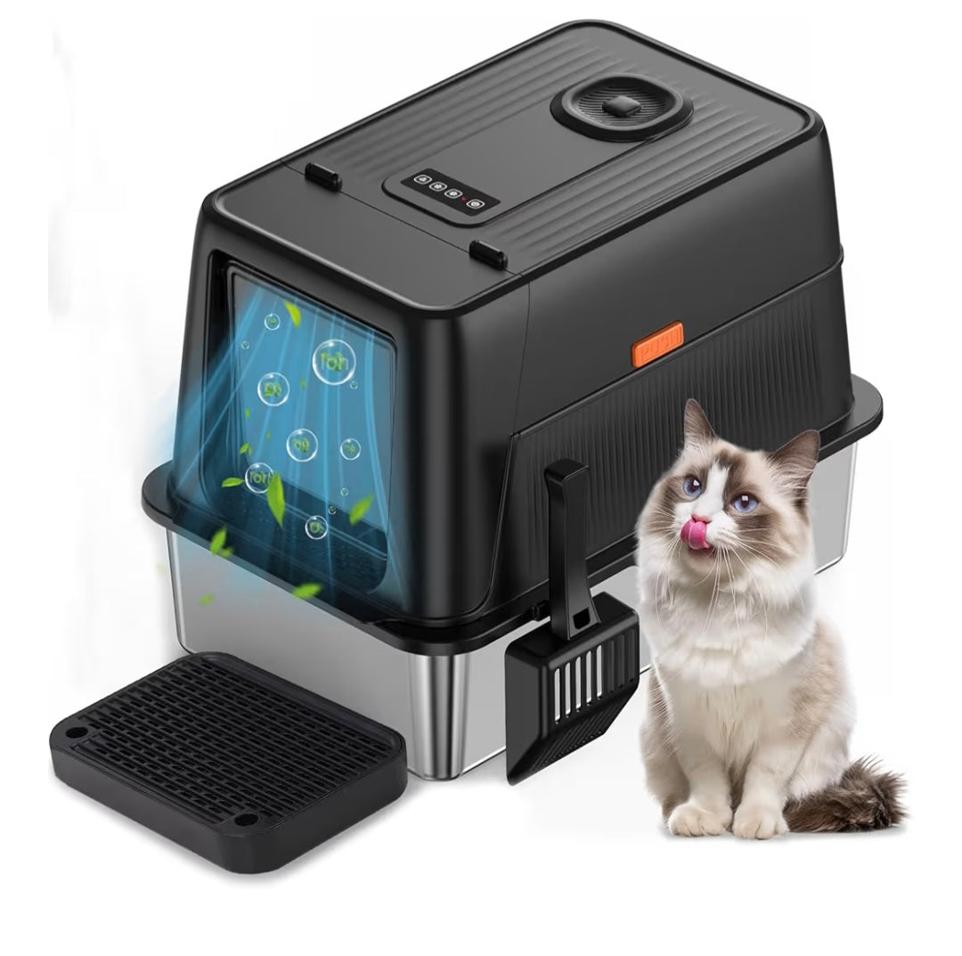 Ventilation Stainless Steel Cat Litter Tray with Lid, Detachable Enclosure Litter Tray with Odour Control,Including Scoop&Peda, XXL High Sided Litter Box for Large Cats (62x41x44 cm)